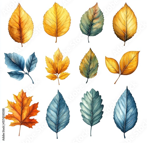 © Background , Obraz premium Watercolor Painting of Assorted Autumn Leaves, Colorful Foliage Arrangement on White Background