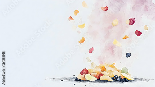 Fototapeta premium Watercolor painting of assorted fruits falling onto a pile.
