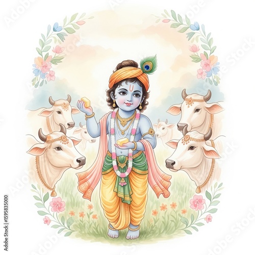 © Tarunkumar, Fototapeta premium Watercolor Painting of Baby Krishna with Cows – Janmashtami Poster HD Image
