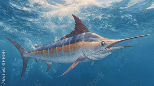 Fototapeta premium Watercolor Painting of Blue Marlin Swimming in Deep Ocean Waters