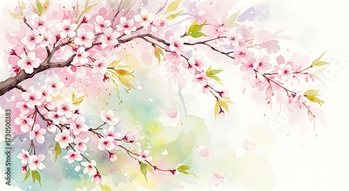 © Matt, Obraz premium Watercolor painting of cherry blossoms on branches with soft pastel background and falling petals art