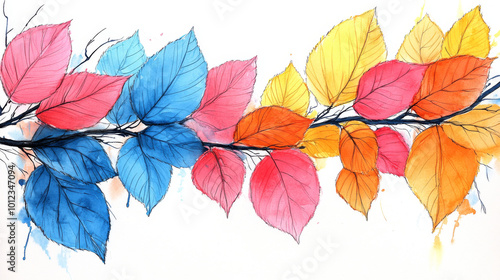 Fototapeta premium Watercolor painting of colorful leaves on a branch.