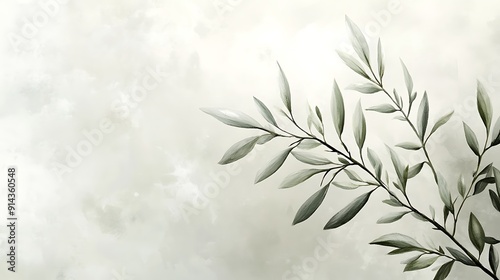 © Handz, Naklejka premium Watercolor Painting of Green Leaves Against a Cloudy Background