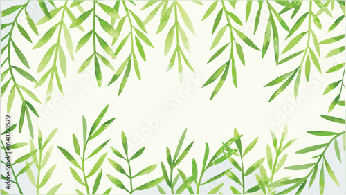 © vector_art, Naklejka premium Watercolor painting of green leaves forming a border around a white space for text or image overlay
