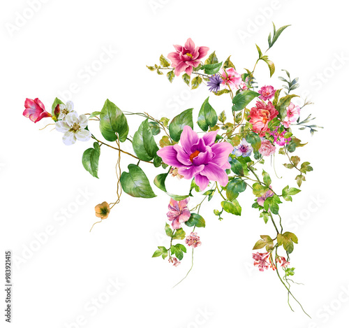 © photoiget, Fototapeta premium watercolor painting of leaves and flower, on white background