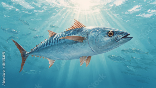 Fototapeta premium Watercolor Painting of Mackerel Swimming in Open Ocean Habitat