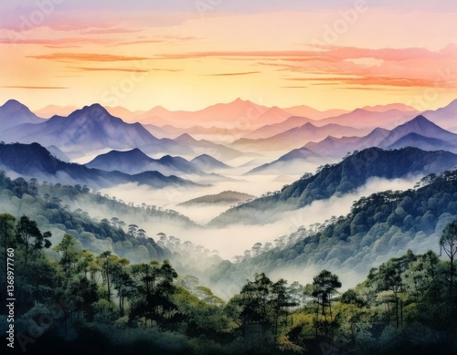 © Alice Makes, Obraz premium Watercolor painting of misty mountains and forest with sunrise in the background landscape wallpaper