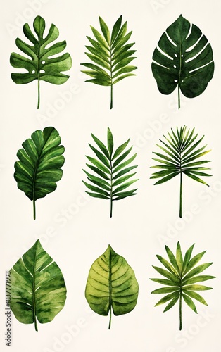 Fototapeta premium Watercolor painting of nine green leaves, perfect for adding a touch of nature to your designs.