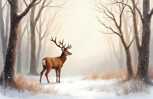 © miss irine, Fototapeta premium Watercolor painting of noble deer with antlers standing in winter forest. Minimalist style artwork with snow covered ground. Tranquil scene of wild animal in fog wood. Calmness, nature, wildlife,