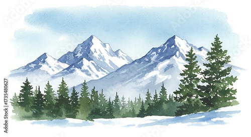 Fototapeta premium Watercolor painting of snow capped mountains and evergreen trees under a blue...