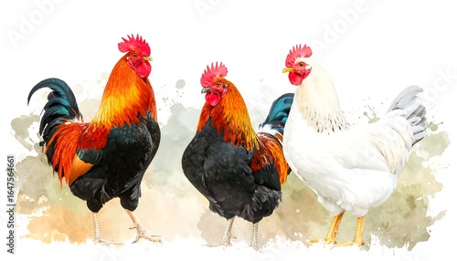 © Bobi, Fototapeta premium Watercolor Painting of Three Roosters with Vivid Plumage and Detailed Crests on a White Background