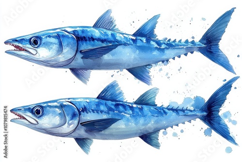Fototapeta premium Watercolor Painting of Two Blue Fish with Open Mouths