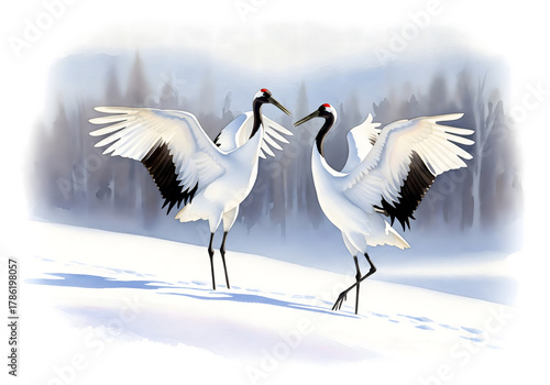 © homydesign, Naklejka premium Watercolor painting of two red crowned cranes displaying in a snowy landscape