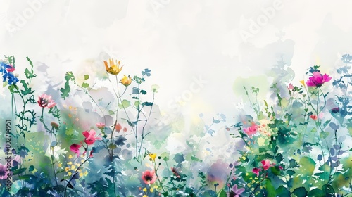 Obraz premium Watercolor painting of wildflowers borders the canvas, illustrating a serene,...