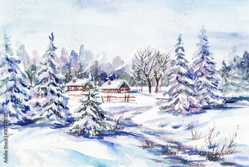 © O'SHI, Fototapeta premium Watercolor painting: winter village landscape