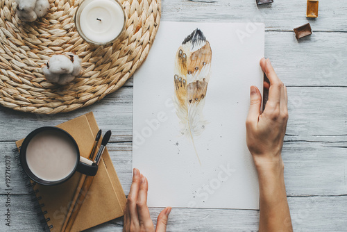 © Denira, Fototapeta premium Watercolor painting with paintbrush and mug of coffee