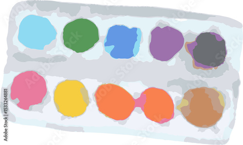 © vectorfusionart, Naklejka premium Watercolor palette tray is displaying ten paint wells on transparent background in flat design