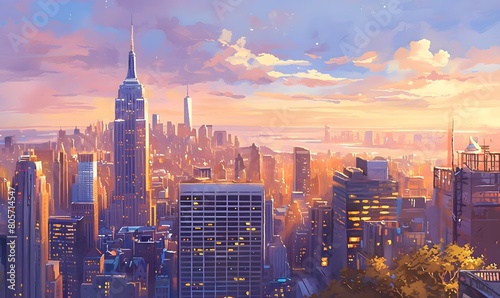Fototapeta premium Watercolor panorama of New York City skyline at dusk,Generative AI