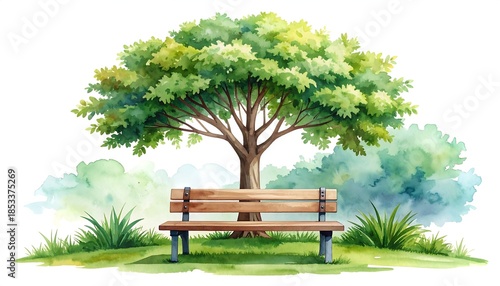© Sasuke, Obraz premium Watercolor park scene with bench and tree