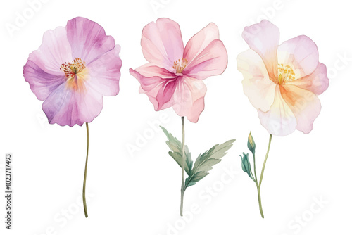 © Cetin, Fototapeta premium Watercolor pastel floral illustration, trio of delicate flowers