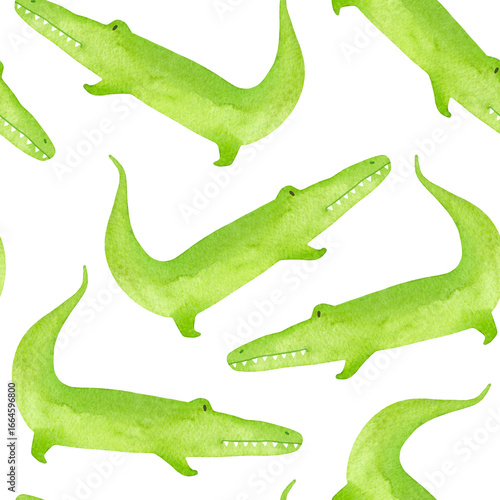 © Anna Bastron, Obraz premium Watercolor pattern with crocodiles on a white background
