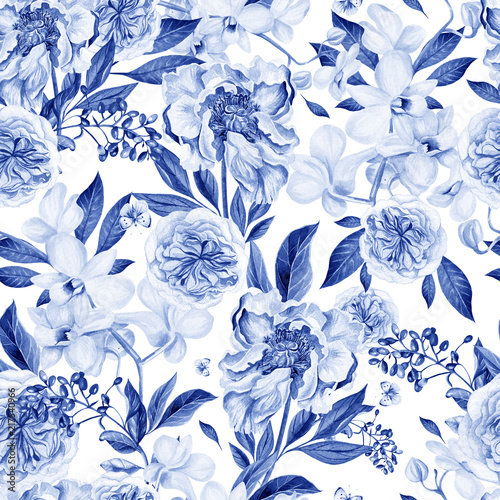 © knopazyzy, Fototapeta premium Watercolor pattern with peony flowers and orchids.