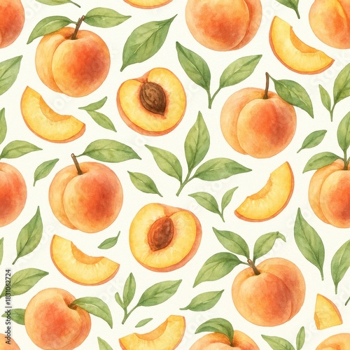 © PT88, Obraz premium Watercolor peach fruit pattern