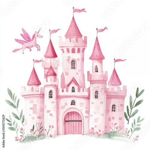 © donchanu, Fototapeta premium Watercolor Pink Castle Illustration with Flying Unicorn Fairytale Fantasy Children s Storybook Art