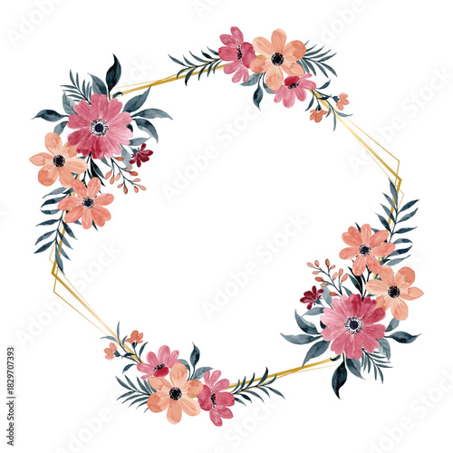 © Asrulaqroni, Fototapeta premium Watercolor Pink Orange Floral Geometric Frame