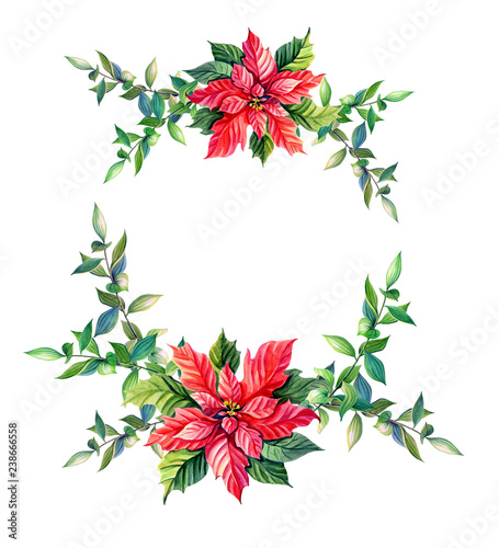© lyubovyaya, Fototapeta premium Watercolor poinsettia, green twig on a white background. Christmas