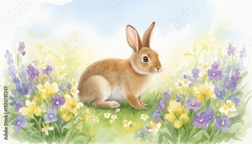 © Konstantin, Obraz premium Watercolor rabbit spring animals bunny in flowers