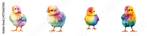 Fototapeta premium Watercolor Rainbow Chicks Set Isolated on White Background, Easter Illustration