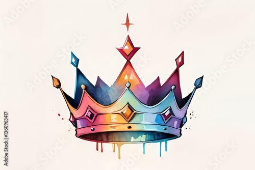 Fototapeta premium Watercolor rainbow crown with dripping paint effect and jewel decorations on light background, artistic royal symbol for creative design projects.