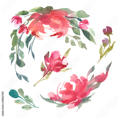 © Kateryna, Obraz premium watercolor red flowers with gray grass on white background for greetings card