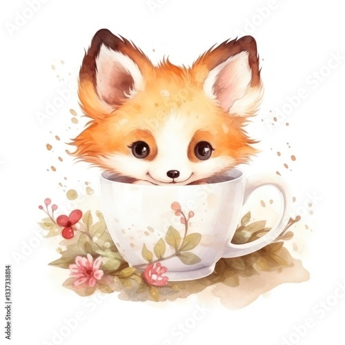 Fototapeta premium Watercolor red fox pop teacup animal cartoon mammal.