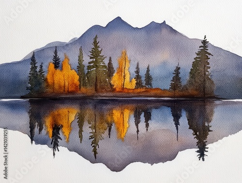 Fototapeta premium Watercolor Reflection Forest edge meets mountain lake trees mirror in water
