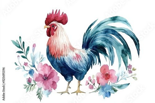 Fototapeta premium Watercolor Rooster Amidst Delicate Floral Arrangement