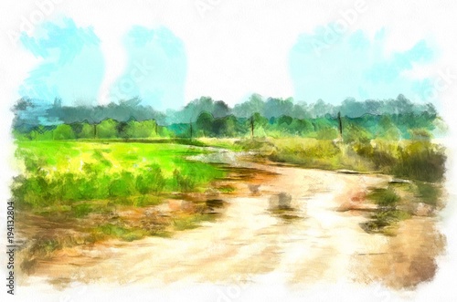 Obraz premium Watercolor rural landscape, road through the field, on a hot Sunny summer day, around only planted fields and far away forest
