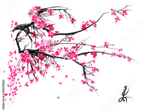 © yucatana, Fototapeta premium Watercolor Sakura Blossom - Japanese Cherry Tree. Artistic Branch Plum Blossom.