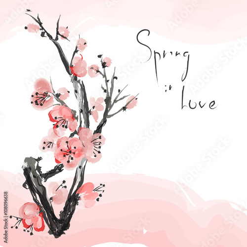 © yucatana, Fototapeta premium Watercolor Sakura Blossom - Japanese Cherry Tree. Artistic Branch Plum Blossom.