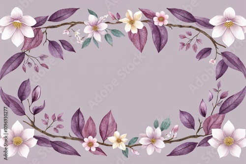© Michael, Fototapeta premium Watercolor Seamless Border Design with Playful Mauve Leaves Cherry Blossoms Daisies and Magnolias for Baby Shower Invitations and Crafts