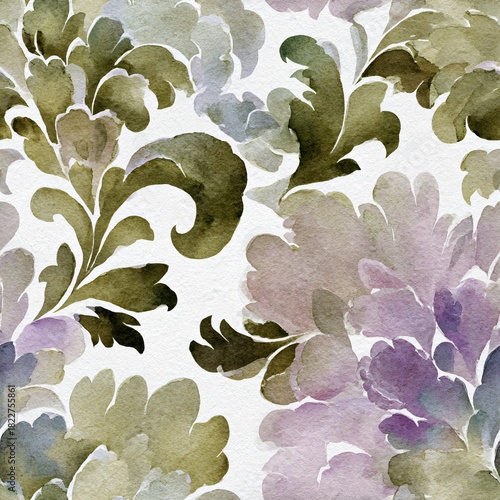 © Margarita Ratatosk, Fototapeta premium Watercolor seamless pattern featuring abstract floral shapes and leaves. Hand painted elegant botanical design for background, textile, fabric, and wallpaper.
