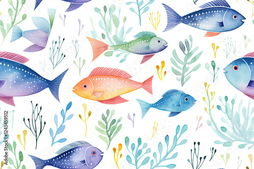 Naklejka premium Watercolor Seamless Pattern of Colorful Fish and Aquatic Plants