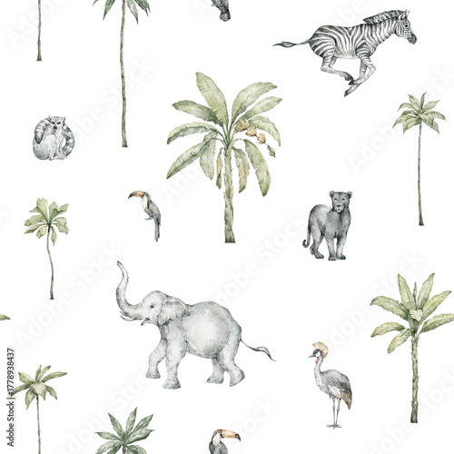 Naklejka premium Watercolor seamless pattern with African animals and palm trees. Zebra, elephant, lemur, leopard, toucan. Tropical, jungle background for wallpaper, textile.