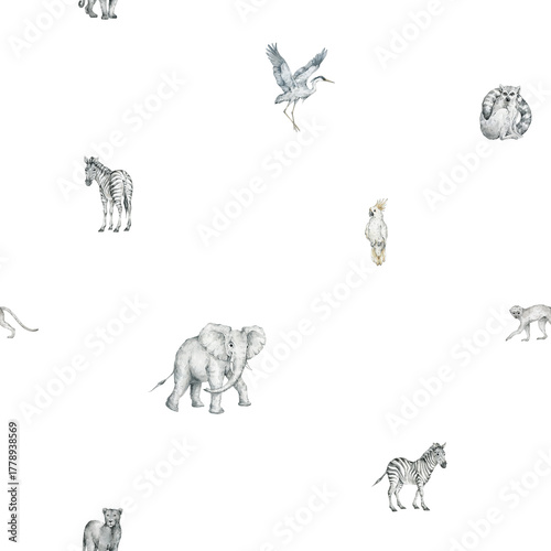 Naklejka premium Watercolor seamless pattern with African animals. Elephant, zebra, lemur, crane, parrot. Tropical, jungle background for wallpaper, textile.