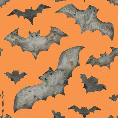 © Liubov, Fototapeta premium Watercolor seamless pattern with black bats. Orange repeatable background for Halloween design create