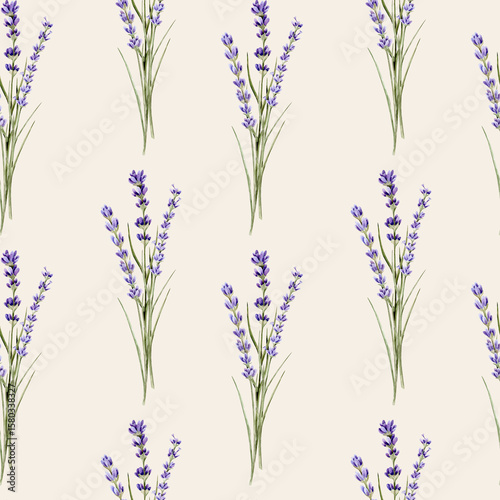 © Tatsiana, Fototapeta premium Watercolor seamless pattern with bouquets with lavender on a beige background