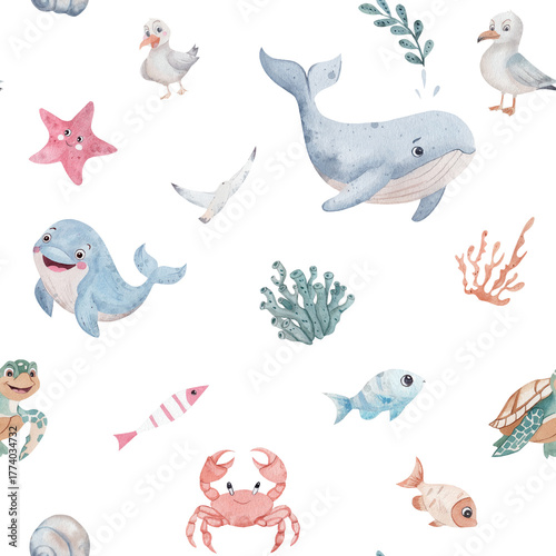 © Oksana, Fototapeta premium Watercolor seamless pattern with cute sea animals. Whale, crab, turtle, fish, coral, and seagulls. Marine-themed illustration in a children style, isolated on white background.
