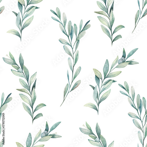 © natikka, Naklejka premium Watercolor seamless pattern with eucalyptus branches . Hand drawn illustration