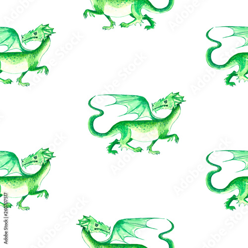 Fototapeta premium Watercolor seamless pattern with fairy dragons, crystals. Hand painted childish background.
